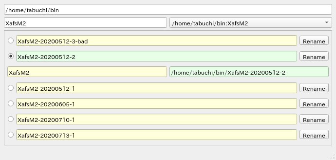 これは上記6つのファイルが存在し、管理対象になっていることを表しています。 また、XafsM2 は XafsM2-20200710-1 へのリンクであることも表しています (3行目、「XafsM2」の表示の右に「XafsM2-20200710-1」と表示され、4行目の先頭のチェックボタンにチェックが入っている)。