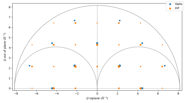 # 逆格子空間内でのブラッグ点の表示 # X線のエネルギーが何も書かれていないが、デフォルトで Cu Ka1 になってるはず。 import xrayutilities as xu import matplotlib.pyplot as plt GaAs = xu.materials.GaAs hGaAs = xu.HXRD( GaAs.Q( 1, 0, 0 ), GaAs.Q( 0, 0, 1 ) ) # GaAs の x=(1,0,0), y=(0,0,1) 断面のプロットと ax, h = xu.materials.show_reciprocal_space_plane( GaAs, hGaAs ) InP = xu.materials.InP hInP = xu.HXRD( InP.Q( 1, 0, 0 ), InP.Q( 0, 0, 1 ) ) # InP の x=(1,0,0), y=(0,0,1) 断面のプロットを重ねている ax, h = xu.materials.show_reciprocal_space_plane( InP, hInP, ax=ax ) plt.show() # これがないと show_reciprocal_space_plane で作った「図」が表示されない