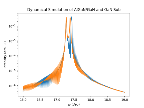 青線が基板(GaN)のロッキングカーブで、オレンジ線がAlGaN/GaNのロッキングカーブ。 2シータはそれぞれについてシミュレーションで計算された $\omega-2\theta$ スペクトルのピーク位置に合わせて計算されてます (単純に「一番値が大きいところ」なので、AlGaN/GaN も基板のピークを捕まえてるかも)。 いずれにしても、AlGaN/GaN のロッキングカーブは、基板(GaN)のスペクトルを含んでしまってます。 これは、$2\theta$を制限しない計算になっているためで、現実の測定で言うと、検出器前スリットを前回にして測定している状況に相当します。 現実でも、この様な設定で測定を行うとロッキングカーブを見ているのか$\omega-2\theta$を見ているのかよくわからなくなりますが、 この計算はそれを再現していることになります。
