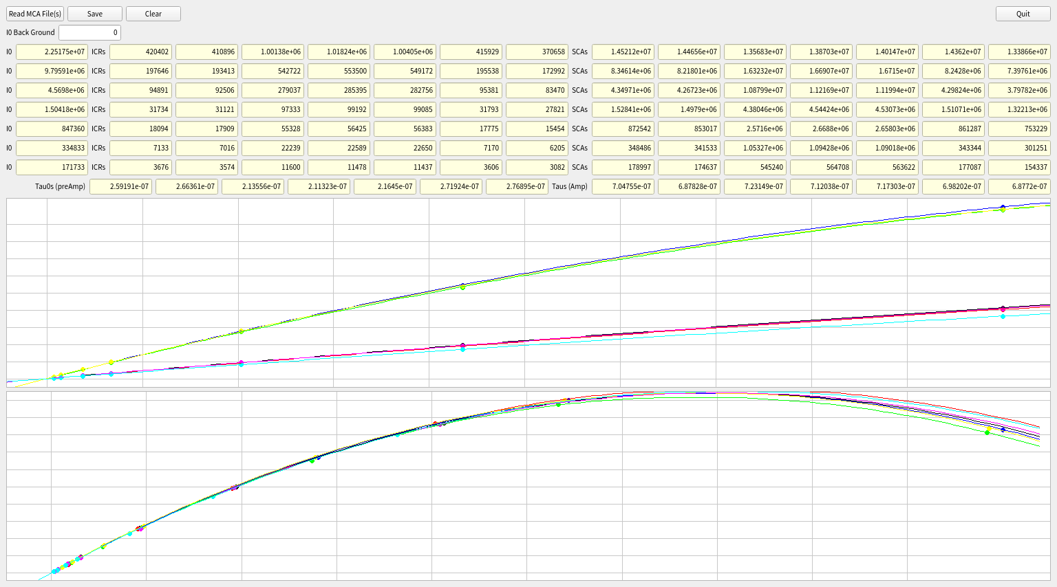 DeadTime2 が元々想定していた入力は XafsM2 が生成する蛍光スペクトルのファイル(MCAファイル)です。 現在のバージョンでは、I0, ICR, SCA の値が書かれた次の様な形式のファイルを読み込んで計算することができます。