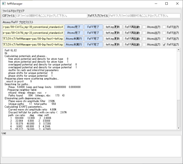 00-CIF フォルダ内に何か cif ファイルを置いて feffManager を起動すると、feffManager は自動的にそのファイルを読んで atoms, feff を連続実行します。結果は 00-RES フォルダに置かれます。