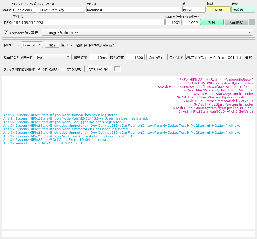 RemoteEx からできることの大半は HiPic2Stars 経由で Stars からアクセスできるようになりますが、 HiPic2Stars の本来の目的は Starsクライアントの一つである XafsM2 と連携して、浜松ホトニクスのカメラを制御し 2次元 / 3次元の XAFS 測定をサポートすることです。 そのために、この目的に特化した機能を提供することを目指しています。