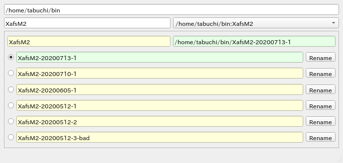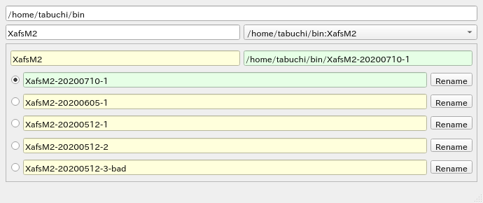 これは上記6つのファイルが存在し、管理対象になっていることを表しています。 また、XafsM2 は XafsM2-20200710-1 へのリンクであることも表しています (3行目、「XafsM2」の表示の右に「XafsM2-20200710-1」と表示され、4行目の先頭のチェックボタンにチェックが入っている)。