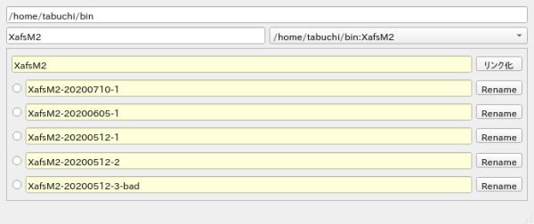 などの点が、先程の例との違いです。 ここで、3行目の「リンク化」というボタンを押すと、今のターゲット名のファイル(XafsM2)が、 『XafsM2-「今日の日付」-「通し番号」』という名前に変更され、XafsM2 はそのファイルへのリンク/エイリアスに変わります。