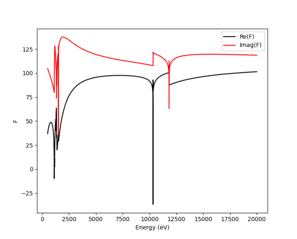 # # 構造因子の計算 (エネルギー依存) # import xrayutilities as xu import numpy import matplotlib.pyplot as plt GaAs = xu.materials.GaAs energy= numpy.linspace(500, 20000, 5000) # 500 - 20000 eV F = GaAs.StructureFactorForEnergy(GaAs.Q(1, 1, 1), energy) plt.figure(); plt.clf() plt.plot(energy, F.real, '-k', label='Re(F)') plt.plot(energy, F.imag, '-r', label='Imag(F)') plt.xlabel("Energy (eV)"); plt.ylabel("F"); plt.legend() plt.show()