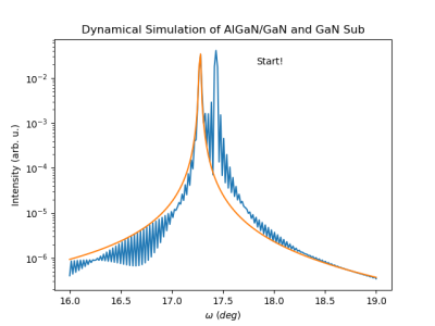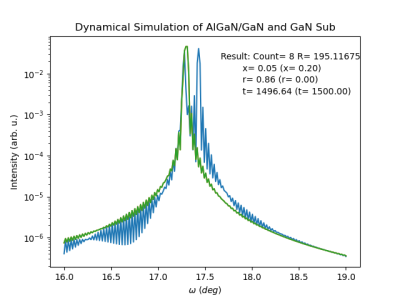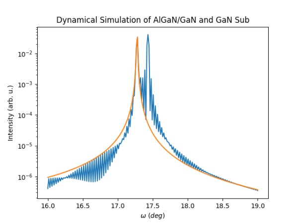 青線が基板(GaN)のロッキングカーブで、オレンジ線がAlGaN/GaNのロッキングカーブ。 2シータはそれぞれについてシミュレーションで計算された $\omega-2\theta$ スペクトルのピーク位置に合わせて計算されてます (単純に「一番値が大きいところ」なので、AlGaN/GaN も基板のピークを捕まえてるかも)。 いずれにしても、AlGaN/GaN のロッキングカーブは、基板(GaN)のスペクトルを含んでしまってます。 これは、$2\theta$を制限しない計算になっているためで、現実の測定で言うと、検出器前スリットを前回にして測定している状況に相当します。 現実でも、この様な設定で測定を行うとロッキングカーブを見ているのか$\omega-2\theta$を見ているのかよくわからなくなりますが、 この計算はそれを再現していることになります。